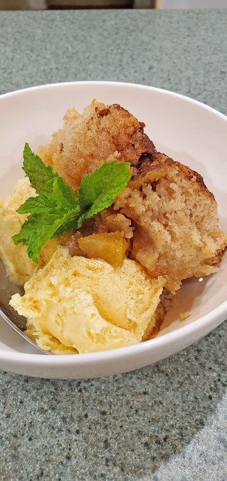 Once butter is browned, remove the pan from the oven. Pour mixture over the butter, but do not stir. Spoon fruit over the batter evenly. Sprinkle with cinnamon sugar and dot with butter. Bake for 35 – 40 minutes or until center is set. You will know it’s done when a toothpick inserted in the center comes out clean. To serve, place a heaping scoop of peach cobbler in a bowl with cold ice cream or fresh whipped cream and garnish with mint. Sprinkle with more cinnamon sugar to finish.