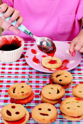 8. Take a pair of cookies and spread teaspoon of jelly on the bottom one. Place the other circle with the face on top and sandwich together. Repeat with the remaining cookies.