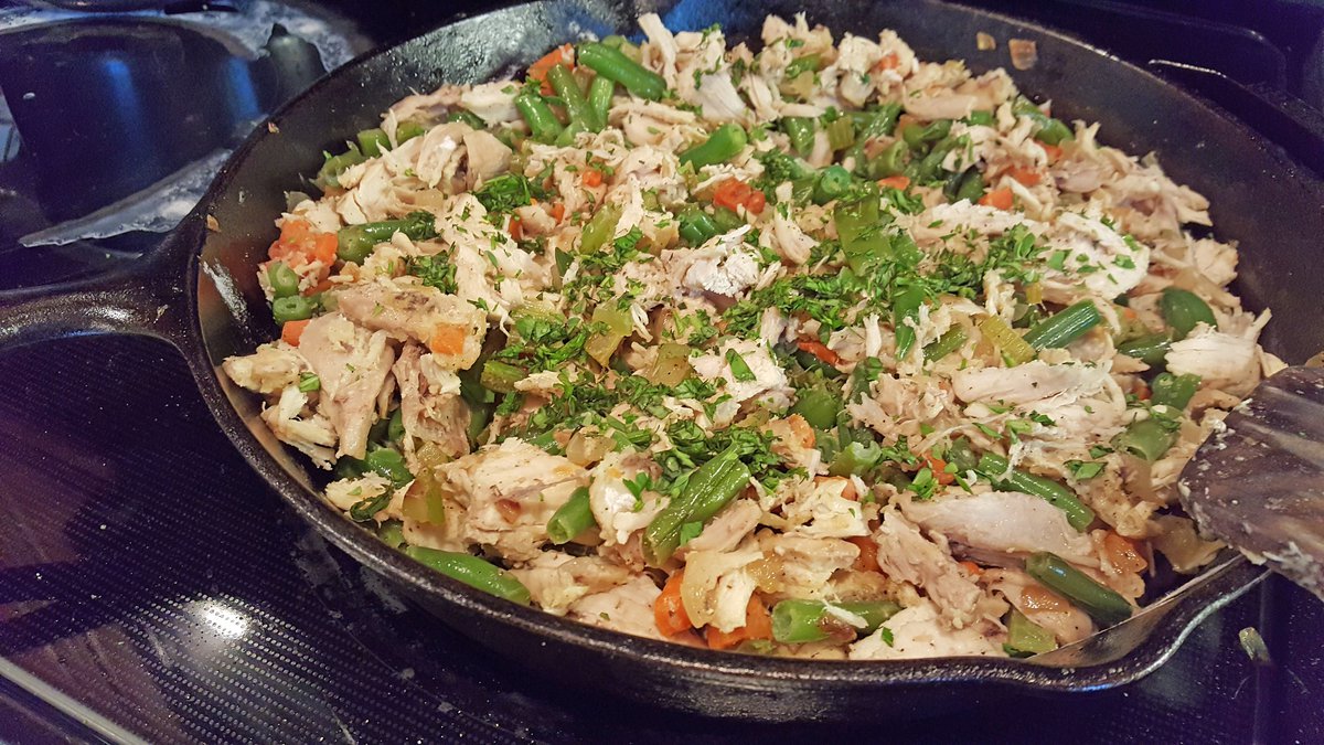 Preheat the oven to 400 degrees. In a cast iron skillet over medium heat, get the bacon grease hot. Add in the celery, carrots and onions and saute for about 5 minutes until softened. Season with salt and pepper.