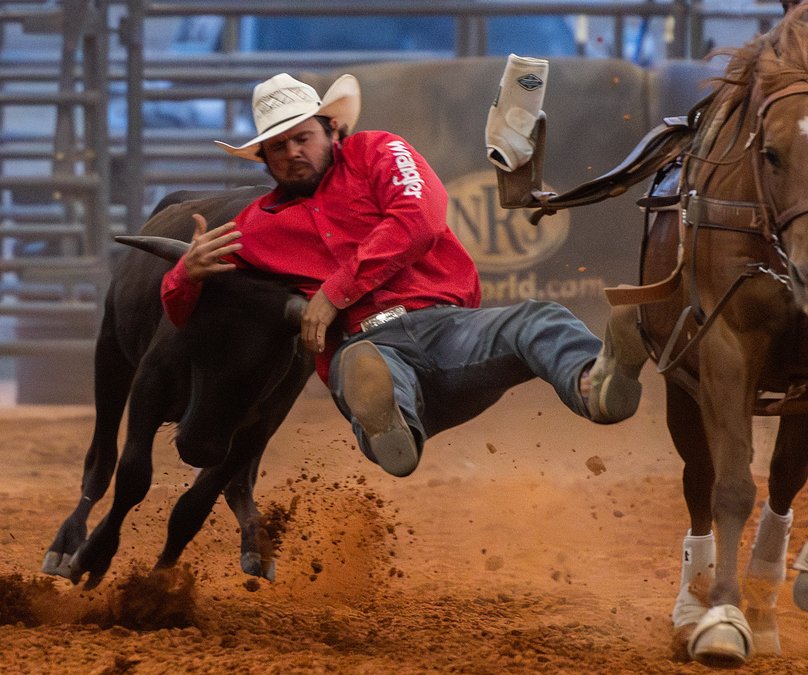 Jace McGonagill of Jeffersonville, Ga. makes quick work of his turn in the steer wrestling event during the 2026 Statesboro Kiwanis Rodeo at the Bulloch County Agricultural Complex on Thursday, April 23.