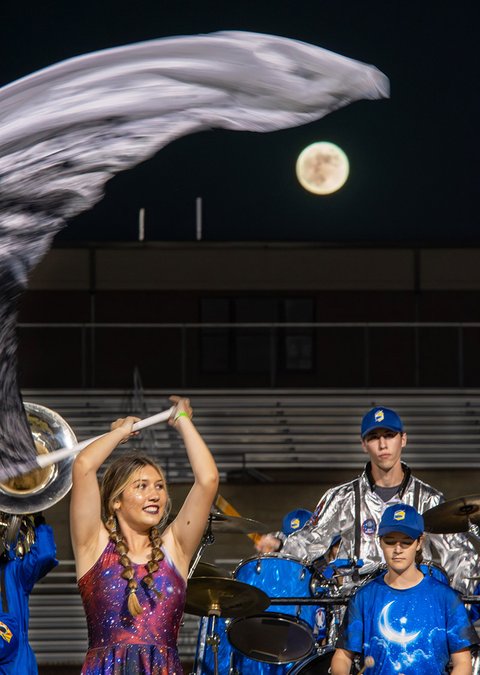 With the real moon providing a backdrop, Southeast Bulloch Marching Band's Addie Smith, left, Audrey Fowler, right, and Charlie Waters play their parts as The Swarm performs their "To the Moon" show during the East Georgia Marching Championships at Statesboro High School on Saturday, Oct. 28. The Swarm captured 3rd place overall, 2nd place in Class 2nd place in Division and a Superior rating during the competition featuring 16 bands.