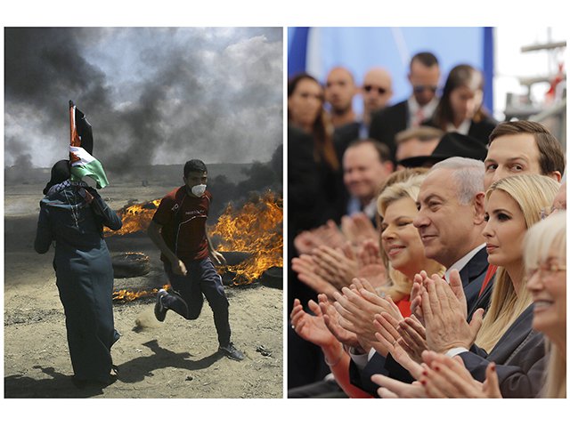GAZA CITY, Gaza Strip — In a jarring contrast, Israeli forces shot and killed at least 55 Palestinians and wounded more than 1,200 during mass protests Monday along the Gaza border, while just a few miles away Israel and the U.S. held a festive inauguration ceremony for the new American Embassy in contested Jerusalem.