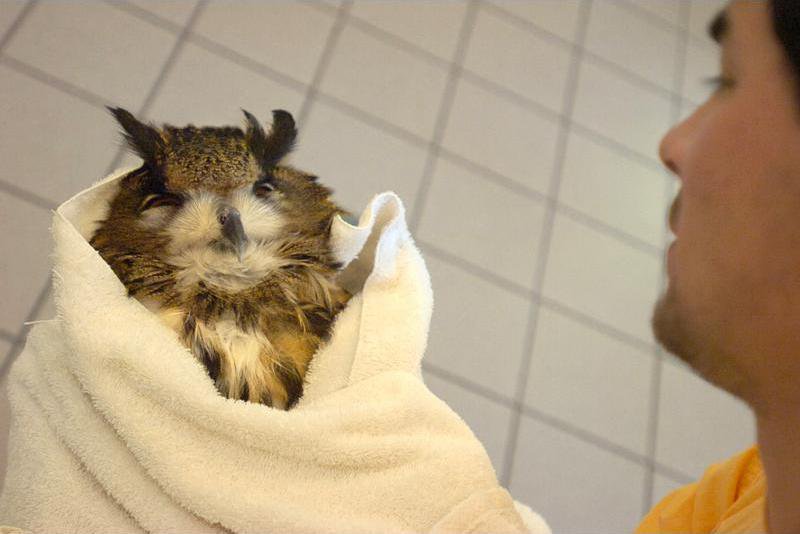 David Suttinger, a coordinator at Georgia Southern University's Center for Wildlife Education, cradles Majesty the Eurasian Eagle Owl as he awakes from anethesia after a physical examination Saturday. Exams are being conducted on a wide variety of species at the Center this weekend as part of a joint effort by veterinary medicine students and staff from Georgia Southern, the University of Georgia, and Ogeechee Technical College.