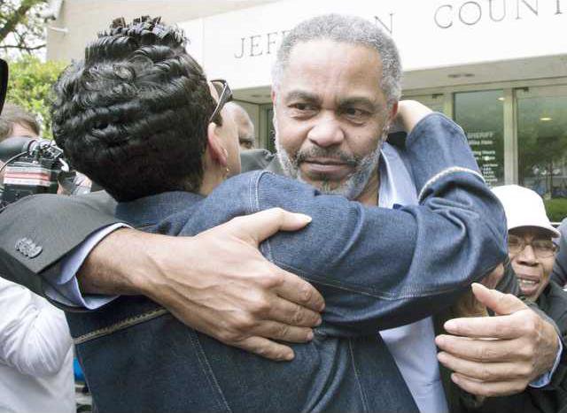 Ray Hinton was 29 when he was arrested for two 1985 killings. Freed at age 58, with grey hair and a beard, he was embraced by his sobbing sisters, who said "thank you Jesus," as they wrapped their arms around him outside the Jefferson County Jail.