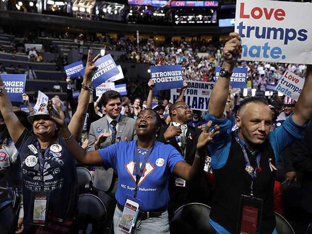 But in Philadelphia, Delegates waved "Love Trumps Hate" signs and cheered as immigration supporters, gay rights advocates, and labor leaders took the stage.