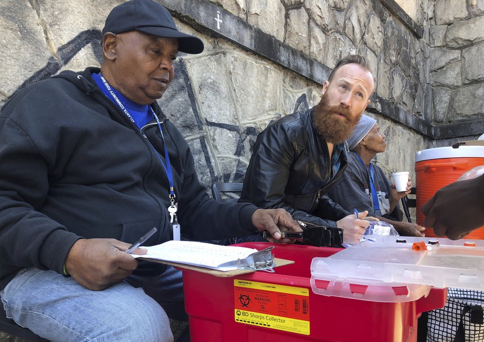 ATLANTA — James Lane has a backpack full of syringes slung across his shoulder as he goes to exchange used needles for sterile ones at a small booth set up by an Atlanta needle exchange clinic. The clinic, which operates in an area known as a hot spot for drug use in Atlanta, collects and distributes syringes. It's among just a few of its kind operating publicly in Georgia and a godsend to Lane, who says he turned to heroin and cocaine to self-medicate for post-traumatic stress.