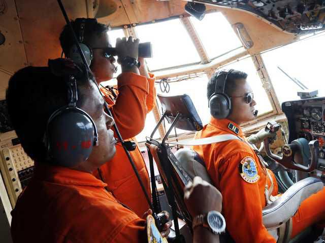 An Associated Press photographer flew in a C-130 transport carrier with Indonesia's Air Force for 10 hours Monday over a large section of the search area between Kalimantan and Belitung. The flight was bumpy and rainy at times. It hovered low at 1,500 feet, giving clear visibility to waves, ships and fishermen, but there was no sign of the plane.