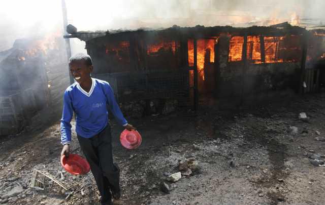 In Mathare, mothers clutching wide-eyed infants and suitcases were evacuated by riot police while angry youths armed with machetes and axes heaped abuse on the police as the slum burned.