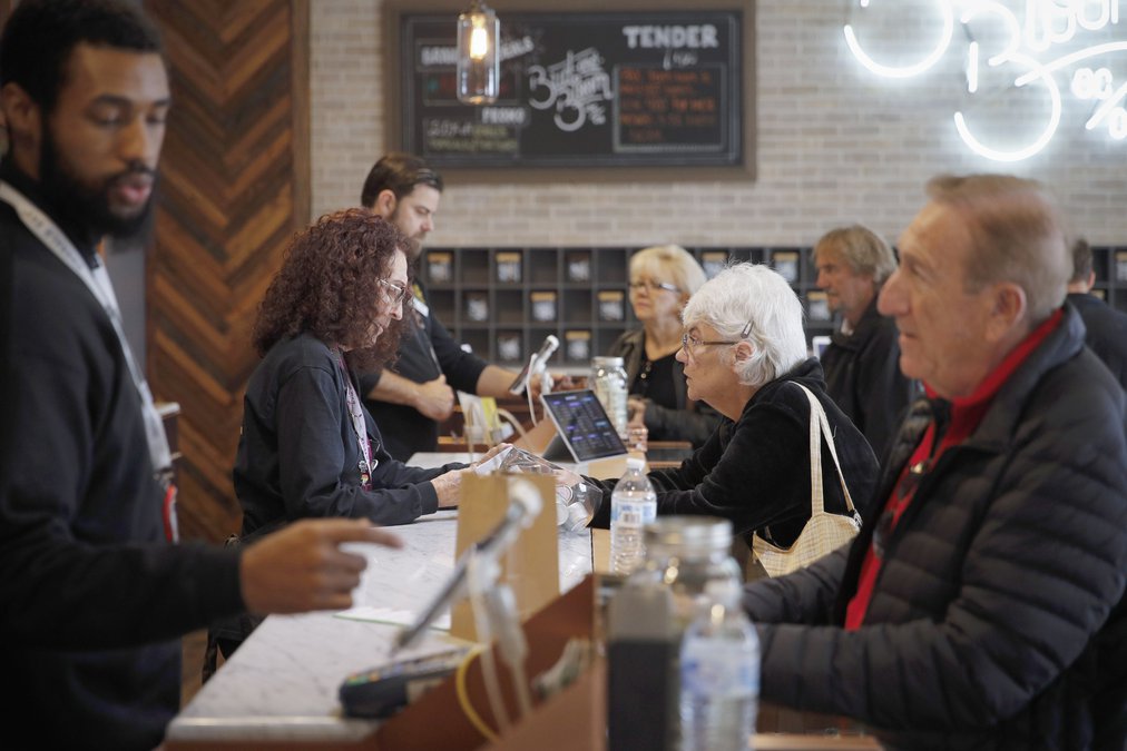 There they board a bus for a quick trip to a building that, save for the green Red Cross-style sign in the window, resembles a trendy coffee bar. The people, mostly in their 70s and 80s, pass the next several hours enjoying a light lunch, playing a few games of bingo and selecting their next month's supply of cannabis-infused products.