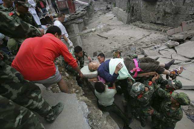 Buses carrying survivors headed away from Beichuan, which was flattened by the quake. Footage on CCTV showed few buildings standing amid piles of rubble in a narrow valley. The six-story Beichuan Hotel sat listing, half its first story collapsed. Medical teams tried to treat the wounded in dirt courtyards littered with broken furniture and rubble.