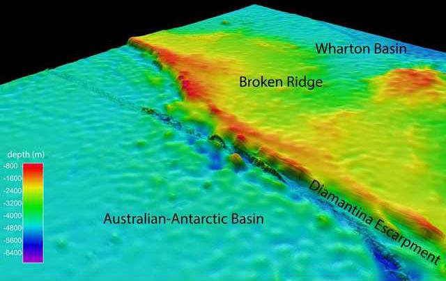 Much of Broken Ridge is covered in a sediment called foraminiferal ooze, made of plankton that died, settled and was compacted by the tremendous pressure from the water above.