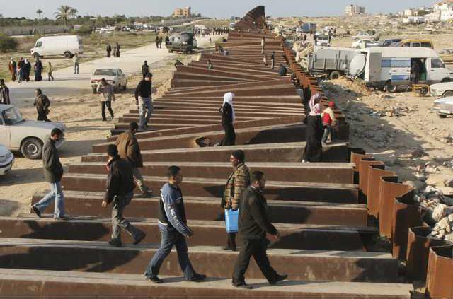 Other Palestinians staggered over toppled metal plates that once made up the border fence, carrying TV sets, cell phones, tires and plastic bottles filled with fuel. Some brought in goats and chickens.