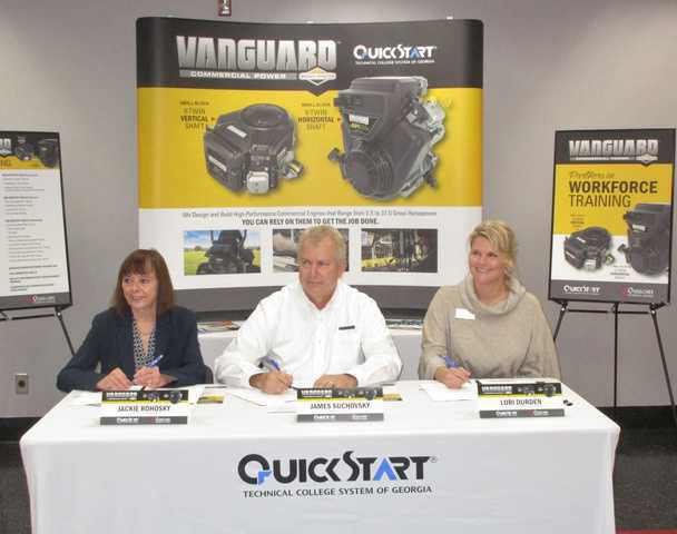 Officials of Briggs & Stratton, the Quick Start program and Ogeechee Technical College signed an agreement Tuesday for training more than 100 new employees Briggs’ Stateboro plant will hire as it begins building Vanguard V-Twin engines. Briggs & Stratton Corporation, headquartered in Milwaukee, Wisconsin, announced in October that it will bring production of the two-cylinder engines home to its plants here and in Auburn, Alabama. Previously, these engines were assembled in Japan in a joint venture with Daihatsu.