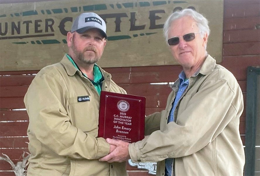Jeffery Biser with Shea Tractor presented the C.C. Murray Innovator of the Year Award to John Emory Brannen, who owns Double B Ranch and works with two of his three sons on their farm.