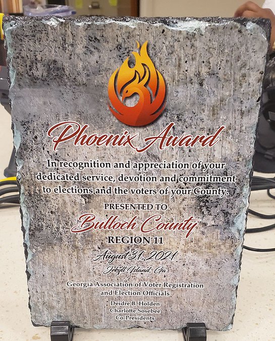 The Phoenix Award is given to one county per region annually that provided exemplary performance during the 2020 elections. The nominations for the award are given by peers across the state in elections and registration offices. Bulloch County is in Region 11, which also includes Bryan, Chatham, Effingham, Jenkins, Liberty, Long, McIntosh and Screven Counties.