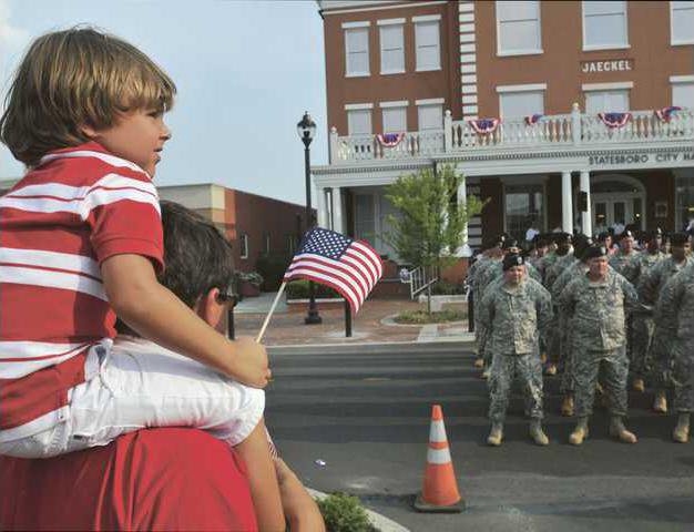 Waving small flags, people of all ages and descriptions waited for the troops to come marching up Oak Street to the center of town, where the City of Statesboro held a "welcome home" celebration centered around the old Jaeckel Hotel - aka Statesboro City Hall.