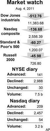 NEW YORK — Gripped by fear of another recession, the stock market suffered its worst day Thursday since the financial crisis in the fall of 2008. The Dow Jones industrial average fell more than 500 points, its ninth-steepest decline.