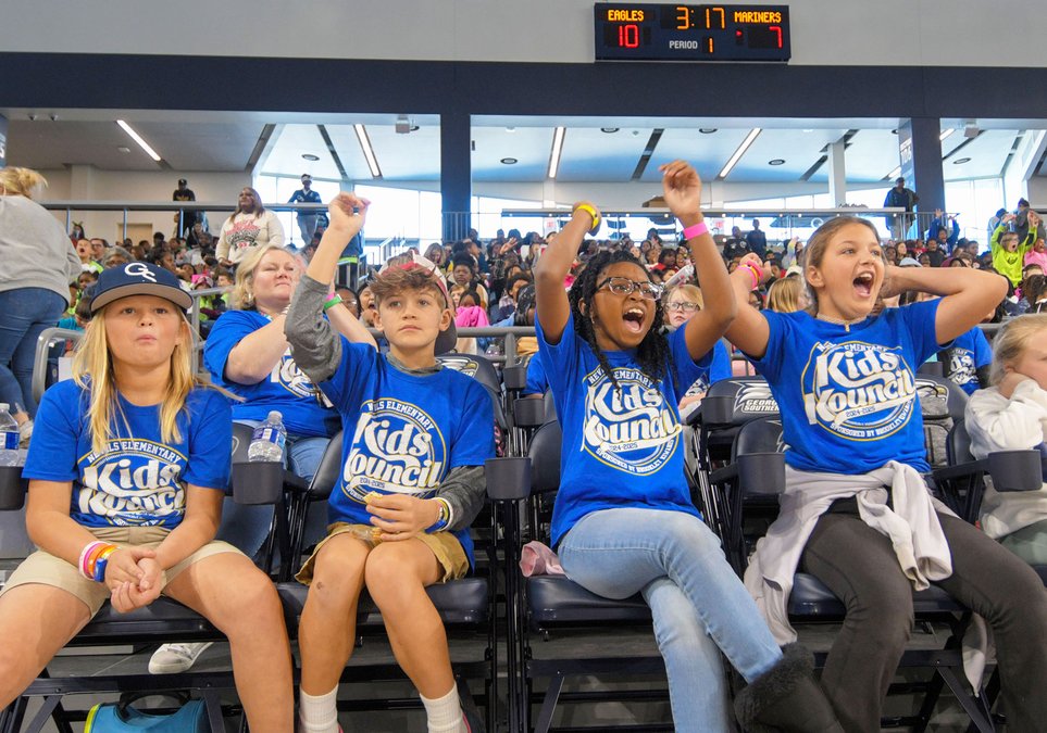 Young fans celebrate a Georgia Southern bucket while helping set a new women's basketball attendance record during the annual Kids Field Trip Day.