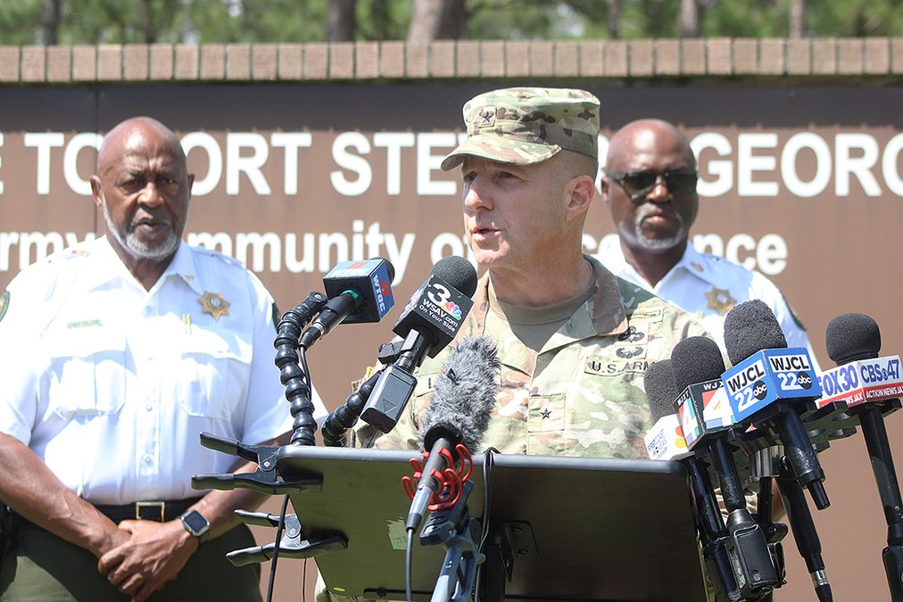 Brig. Gen. John Lubas describes Wednesday's active shooter incident on Fort Stewart. Behind him are Liberty County Chief Deputy Al Hagan and Liberty County Sheriff Will Bowman. - photo by PAT DONAHUE