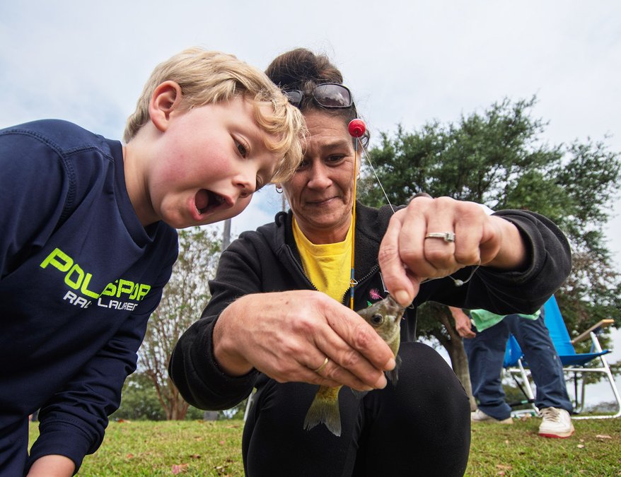 Nala Abraham, 9, of Statesboro learns how to fish by watching mom Pherneicia during the Gary Oglesby Youth Fishing Rodeo.