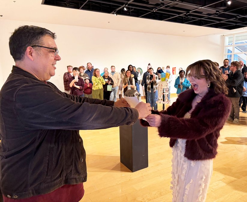 Jerica Scott is excited to receive her Best in Show award from Gallery Director Dr. Jason Hoelscher for her work, a cardboard projection entitled "Wealth Unchecked."