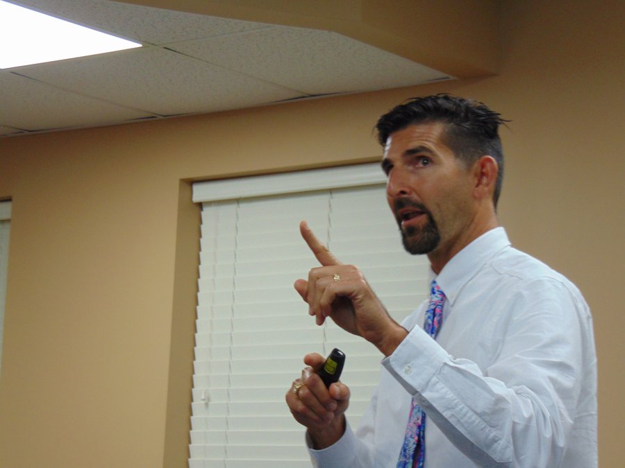 In his slideshow, Brown compared the school tax "elderly exemption" to the regular homestead exemption available to all homeowners, and used the example of a $100,000 home and attached land to compare the effects of individual's school taxes.
