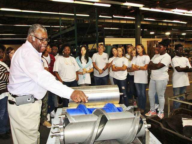 Brodie Plant Manager Ray Mosley asked the students who among them likes math and science. He showed them the two helical, or screw-like, rotors that work together inside some of Brodie's trademarked meters.