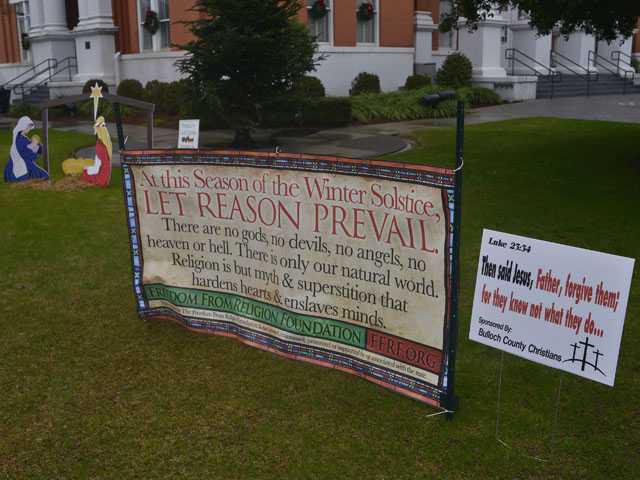 Bulloch County's courthouse square has become a forum for debate over religion. A nativity scene displayed on the courthouse lawn apparently met with the disapproval of a national anti-religion group, which placed a banner denouncing religion on the courthouse square last week. Tuesday, a third display appeared - a Christmas sign set up near the others, placed by a group of "Bulloch County Christians," said Romaine Bradford, spokesman for the group.