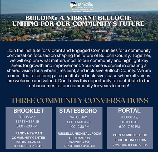The recently founded Institute for Vibrant and Engaged Communities, based at Georgia Southern University, is launching a series of three “Building a Vibrant Bulloch: Uniting for Our Community’s Future” conversations with one Thursday, Sept. 19, from 6 p.m. until 7:30 p.m. in Brooklet at the Randy Newman Community Center, 209 Railroad St.