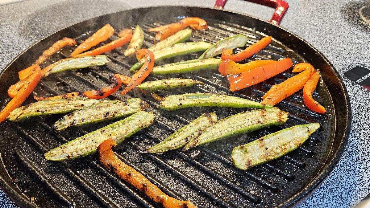My Grilled Okra with Red Bell Pepper is served with fresh herbs and a wedge of lemon, and only requires rinsing the okra before slicing. This dish is Some Kinda Good and adds a pop of color to the plate.