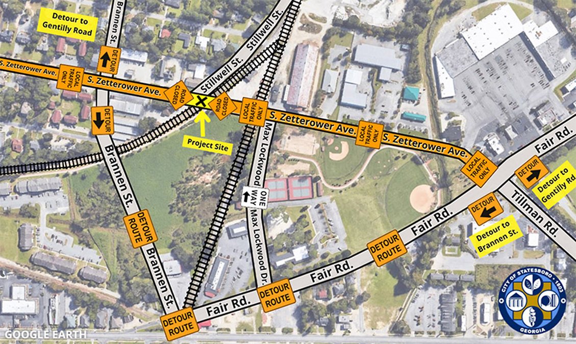 The city of Statesboro will close part of South Zetterower Ave. from Saturday through Tuesday for reconstruction of the railroad crossing at Stillwell St. Stillwell St. is located just north of Brannen St. and just south of Max Lockwood Drive.