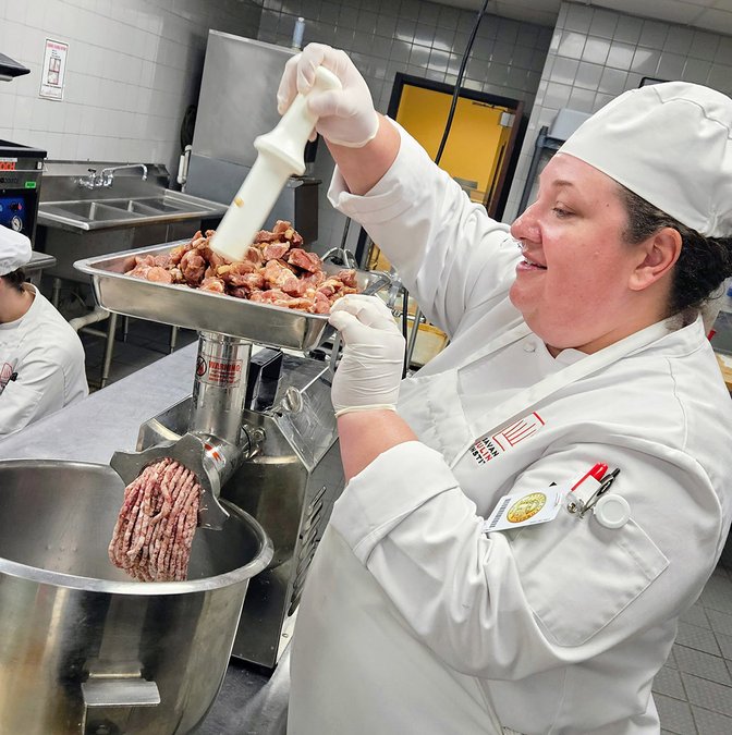 We broke down five pounds of pork butt, which comes from the shoulder of the pig, removing the fat cap and dicing into medium 2-inch cubes. We then ran the meat through the grinder and added spices and seasonings such as dried thyme and allspice. The next technique was whipping the meat mixture in a large blender to ensure a sticky consistency for pushing the meat through the sausage stuffer and into the casings. It was quite a process, and I have a new appreciation for sausage makers. Once the casings were filled, we allowed the outer skin to develop, and later smoked the meat in an electric smoker.