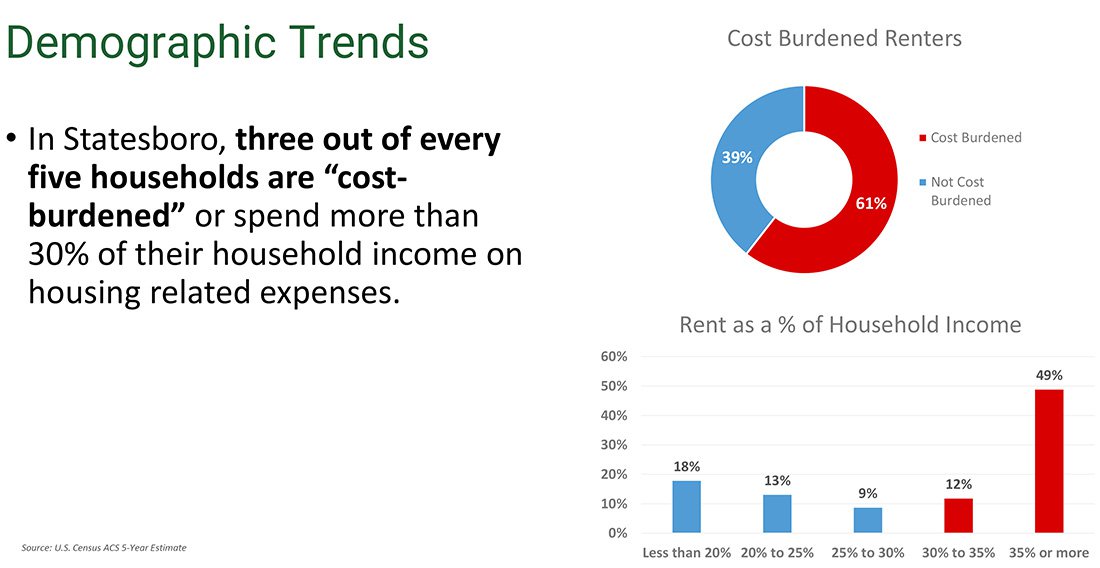 Three-fifths of Statesboro renter households are “cost burdened,” spending more than 30% of their income on rent, according to a consulting group’s housing study and needs analysis commissioned by the city government.