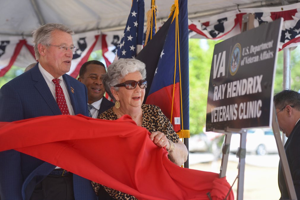 The same breeze that offered some relief from the nearly 100-degree heat assisted Mary Hendrix and U.S. Rep. Rick Allen in unveiling a temporary sign for the newly renamed Ray Hendrix Department of Veterans Affairs Clinic.