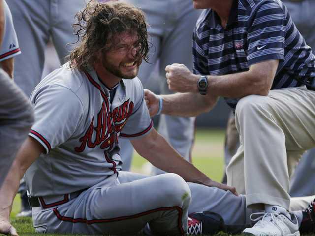Misfortune hit the Braves at the outset of the Rockies' late rally. Reliever Jason Grilli (3-4) tumbled to the ground and suffered a lower left leg injury as he ran toward first to cover the bag when Drew Stubbs, the first batter he faced, hit a grounder that first baseman Chris Johnson ranged to his right to field.