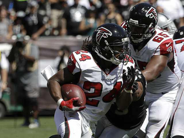 Cornerback Robert Alford intercepted a pass in the end zone, but the play was negated because he pushed off the receiver. The defense allowed four runs of at least 14 yards and hit quarterback Derek Carr only three times.