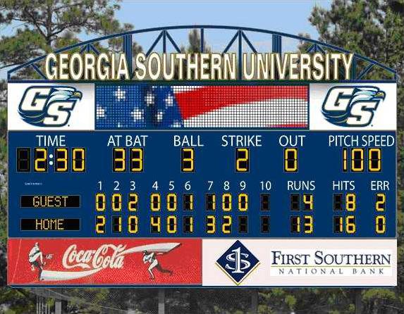 “Georgia Southern has one of the top baseball facilities in the country but our old scoreboard was out-dated. Thanks to First Southern National Bank’s sponsorship, this new scoreboard will certainly enhance J.I. Clements and the fan experience there,” said Baker. “First Southern’s generosity also helps us upgrade out-dated scoreboards and display systems at the Eagle softball field and new swimming facility at the Recreation Activities Center. We already had one home swimming meet and received numerous compliments on the new system.”