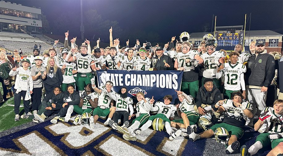 Bulloch Academy's TJ Durden, center, finds himself in the center of the celebration following the Gators' 14-10 victory against First Presbyterian in the 2024 GIAA Class AAAA Championship game at Paulson Stadium on Saturday, Nov. 23.