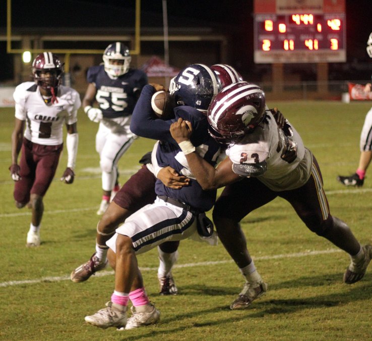 Friday the 13th at Womack Field didn’t see Jason Vorhees with a machete, but the No. 1 ranked Coffee County Trojans carved up the Statesboro Blue Devils thanks to over 250 yards rushing and a suffocating defense as they improve to 7-0 on the season while Statesboro falls to 2-5 and 1-1 in region play.