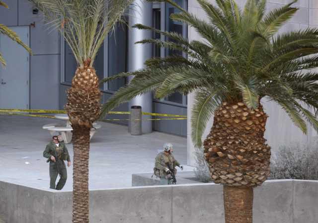 The gunfire erupted moments after 8 a.m. at the start of the work week and lasted for several minutes. Shots echoed around tall buildings in the area, more than a mile (1.6 kilometers) north of the Las Vegas Strip. An Associated Press reporter on the eighth floor of a high-rise building within sight of the building heard more than 20 shots during the sustained barrage of gunfire.