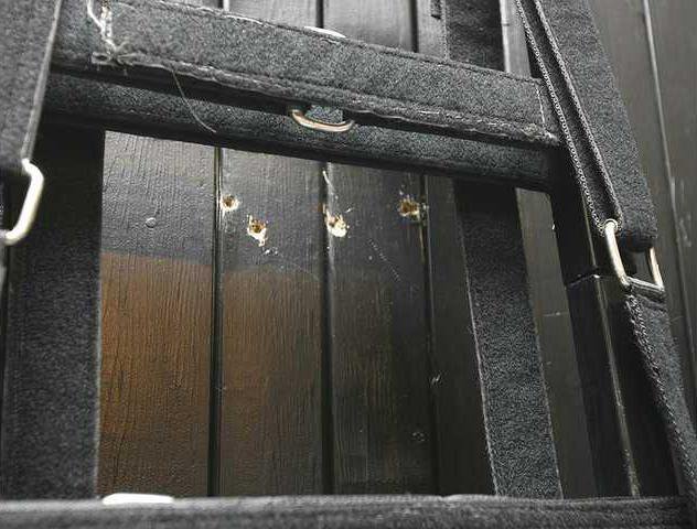 The five executioners, certified police officers who volunteered for the task and remain anonymous, stood about 25 feet away, behind a wall cut with a gunport, and were armed with matching .30-caliber Winchester rifles. One was loaded with a blank so no one knows who fired the fatal shot. Sandbags stacked behind Gardner's chair kept the bullets from ricocheting around the cinderblock room.
